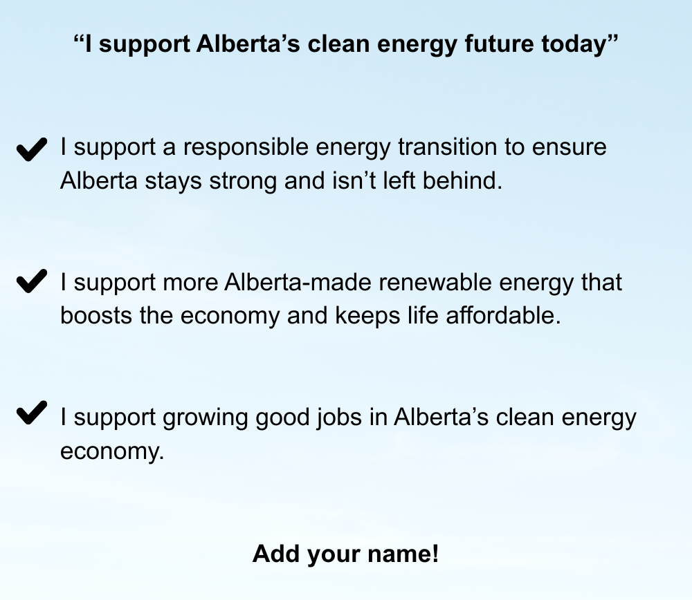 Many Albertans support a responsible energy transition that strengthens our economy, creates good jobs, and keeps life affordable — but too often that support goes unseen. The Clean Energy Pledge is a simple way to add your voice and make that support visible.
